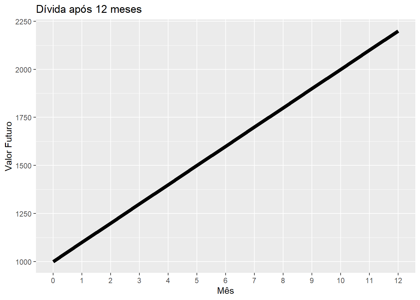 Como foi visto pela fórmula, seria pago o valor de R\$2200,00. Agora, vamos ver a evolução da dívida por meio uma tabela e de um gráfico.