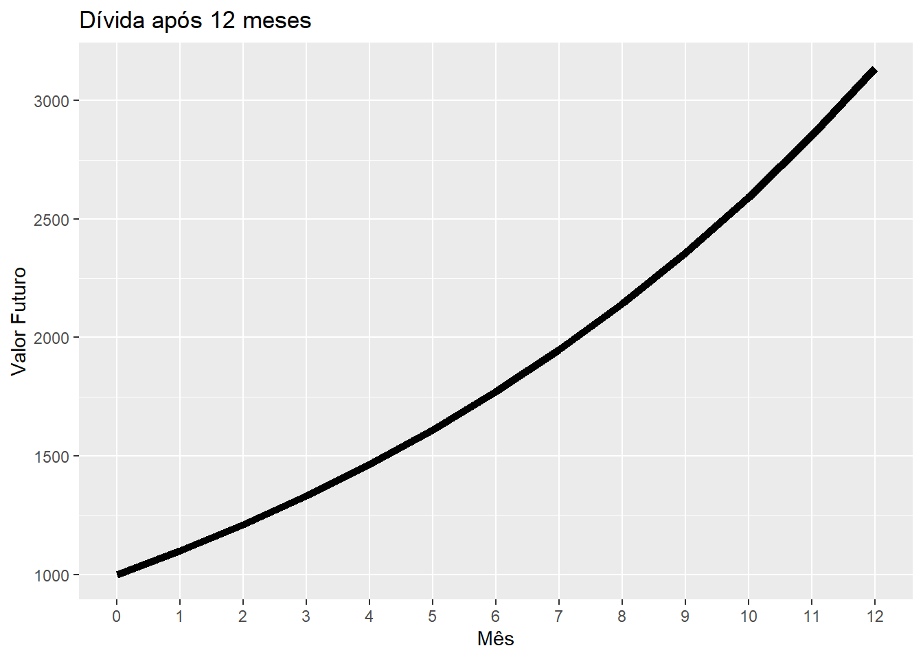 Exemplo: Considere que você solicite um empréstimo de R\$1000,00 e que irá pagar em 12 meses. A taxa de juros que será cobrada será de 10% ao mês no regime de juros compostos. Quanto você irá pagar após os 12 meses?