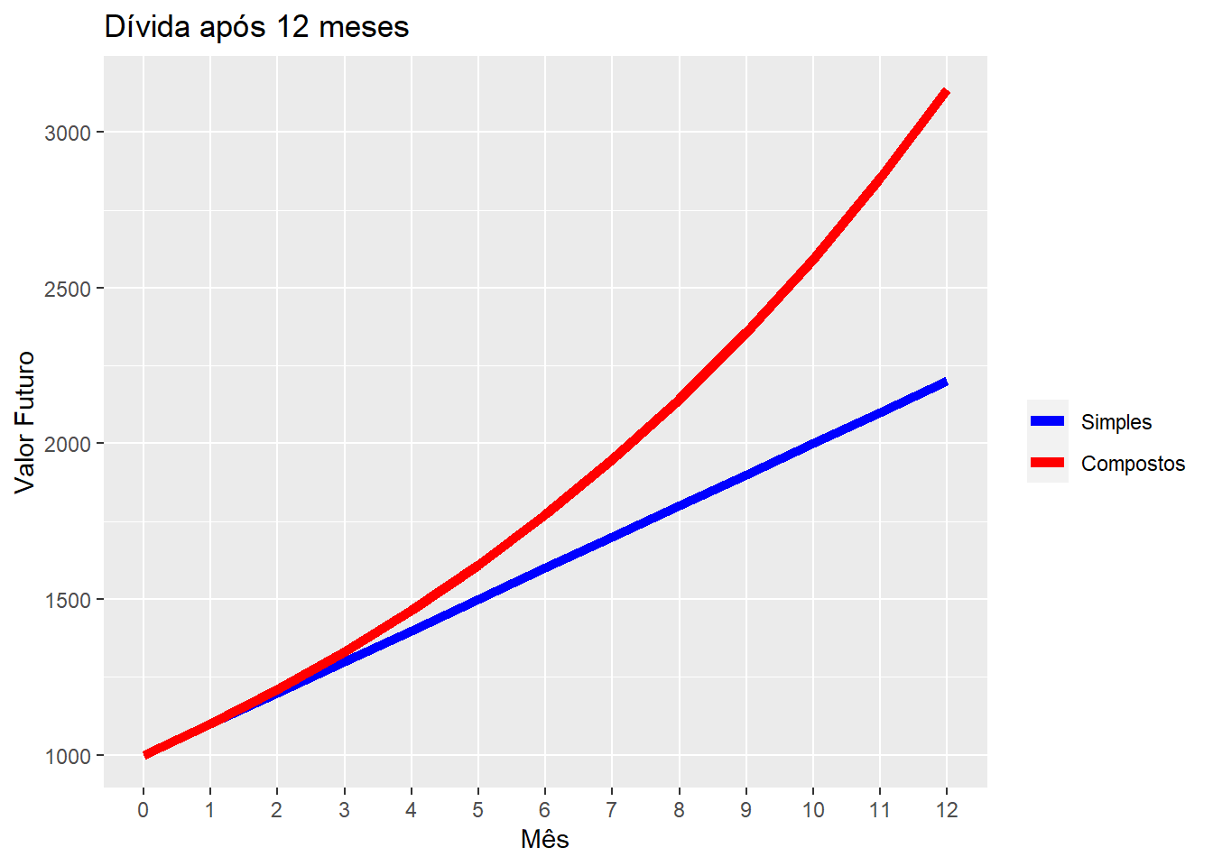 | Mês | Dívida (Juros Simples) | Dívida (Juros Compostos) |