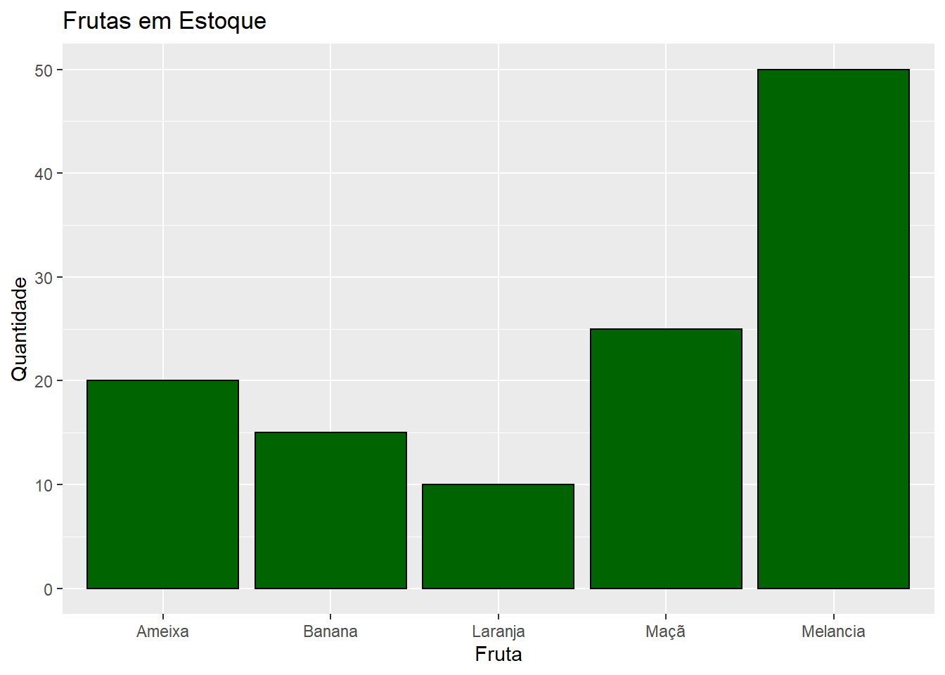 Esse é um exemplo super simples e direto. Como pode-se observar acima, a fruta que mais há em estoque é a melancia, e a que menos tem em estoque é a laranja. Como eu sei disso? Simples! Basta localizar no gráfico qual a coluna mais alta e a mais baixa.