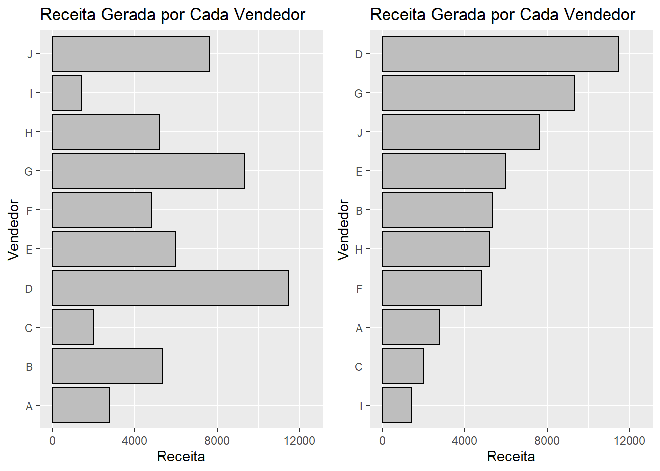Ambos os gráficos acima respondem a pergunta. Afinal, o objetivo era saber quanto cada vendedor gerava de receita. certo? Bem…sim, mas creio que podemos concordar que o gráfico à direita é mais “agradável aos olhos” do que o da esquerda. Claro que depende muito de cada situação (e de cada pessoa), já que podem existir situações em que seja preferível, por exemplo, ordenar os itens em ordem alfabética em vez de ordem decrescente (ou crescente) das quantidades.
