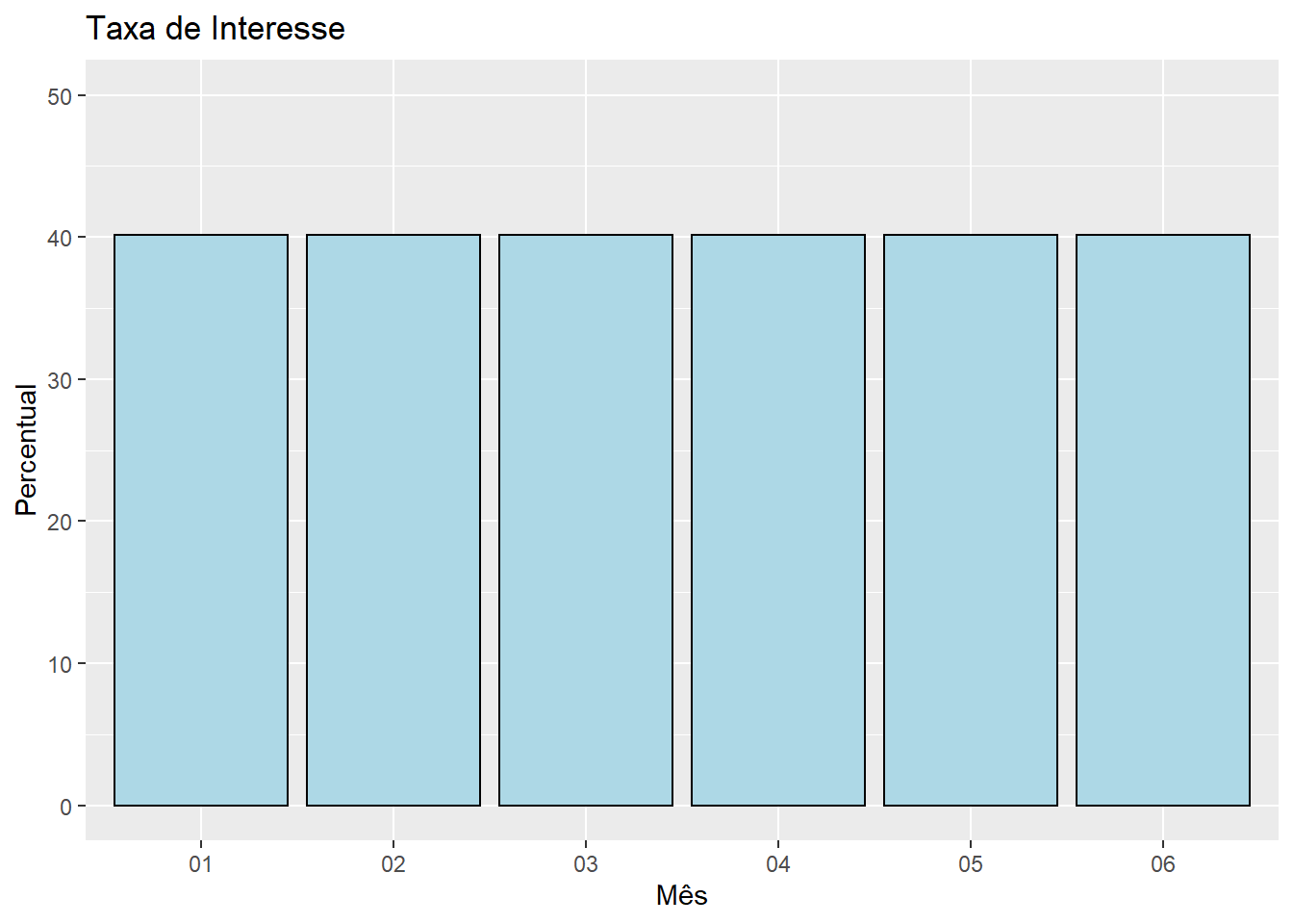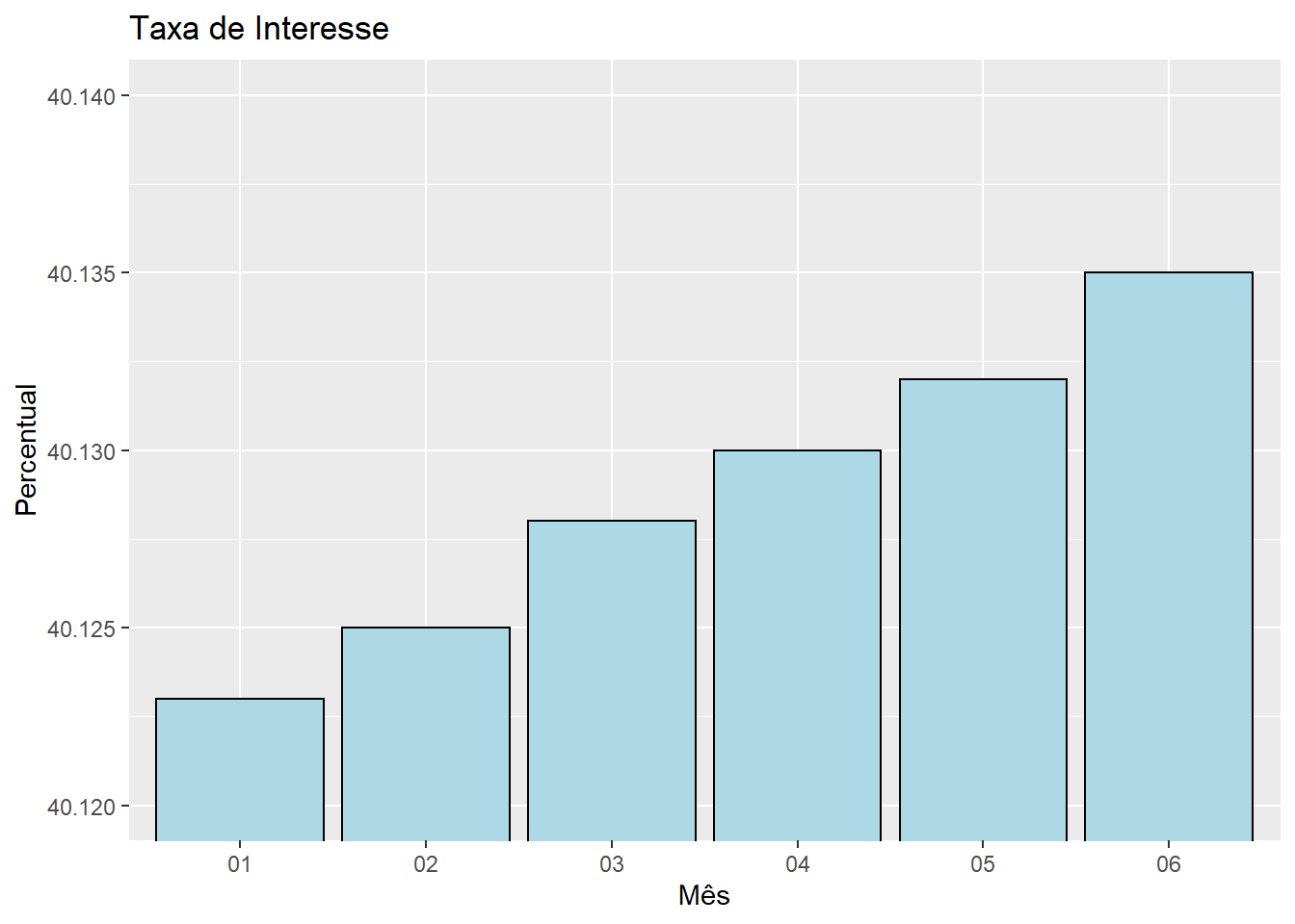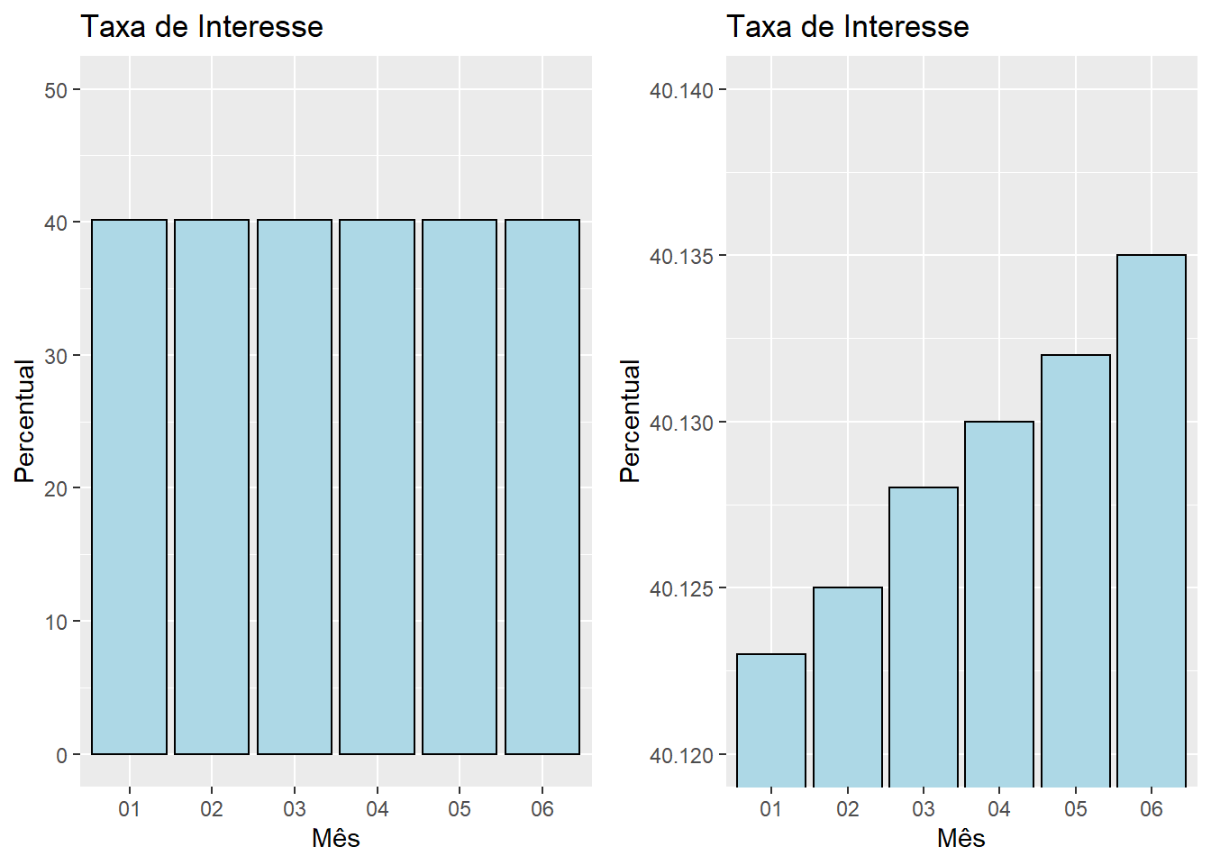 Ambos os gráficos são referentes aos mesmos dados e demonstram a mesma informação: a taxa de interesse, em percentual, ao longo de seis meses. Apesar disso, observe que a escala em ambos é bem diferente, podendo afetar o visual e tendenciar a conclusões imprecisas - por exemplo, que a taxa de interesse aumentou “muito” ao longo dos meses. Portanto, sempre que observar um gráfico, atente-se à escala.